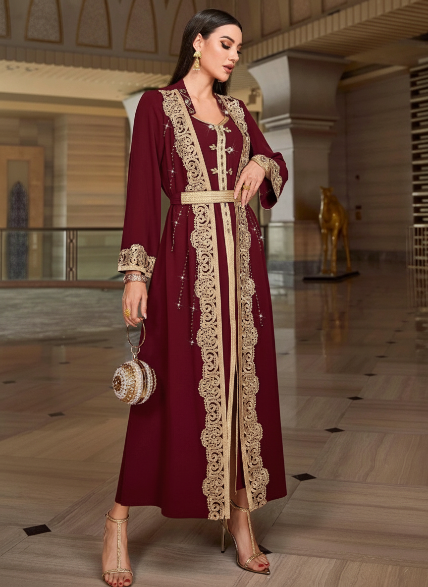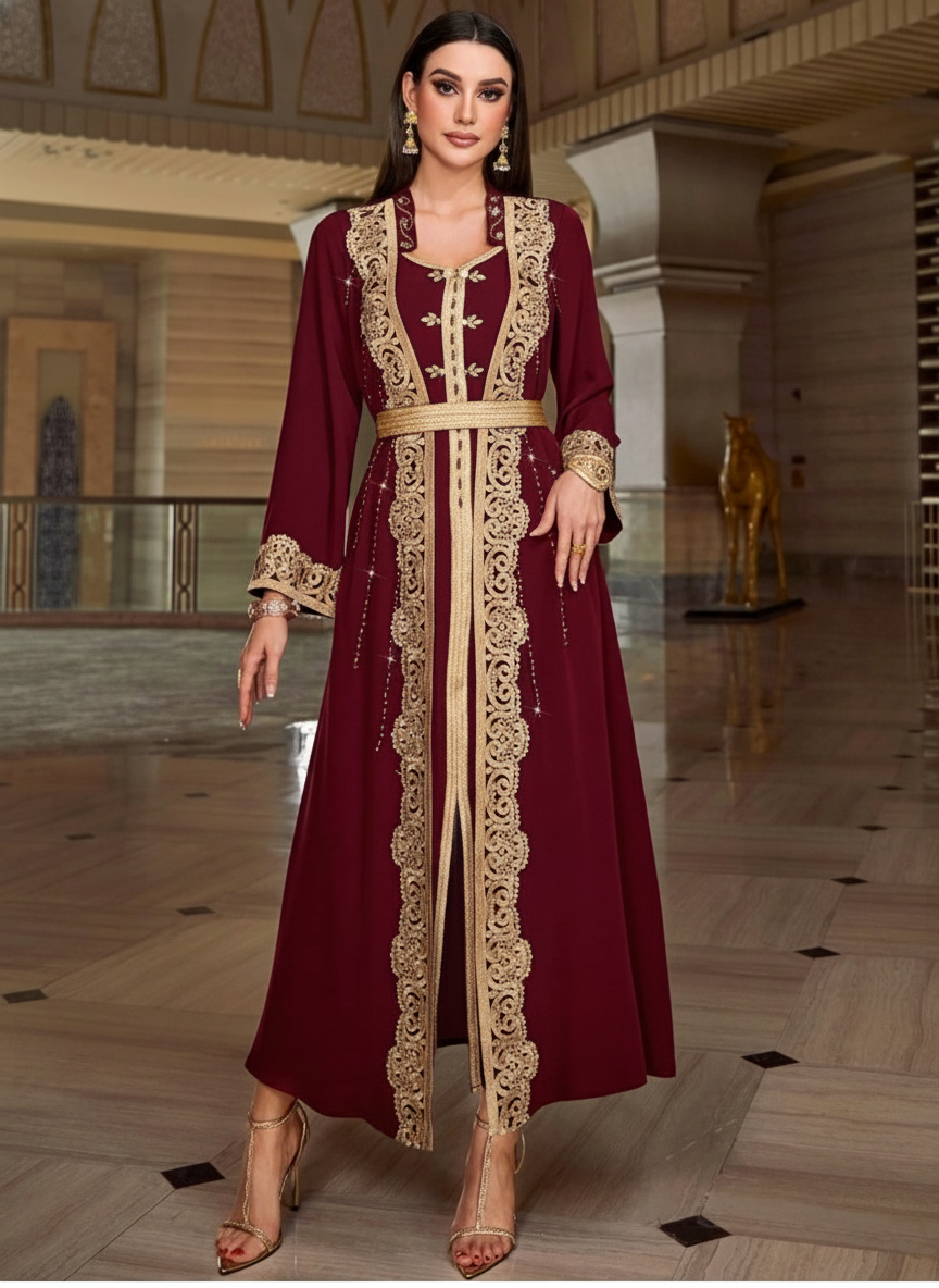 Layrah Burgundy Red Color Block Embroidered Applique 2-In-1 Moroccan Kaftan Dress