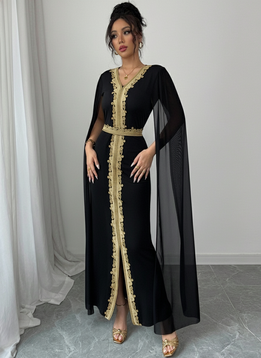 Rafferiza Embroidered Gold Woven Waist Belt V-Neck Cinched Waist Open Slit Sleeve Fitted Shawl Collar Dress For Women Fall Cloth For Women